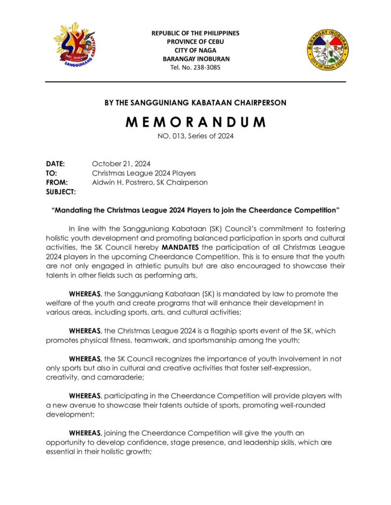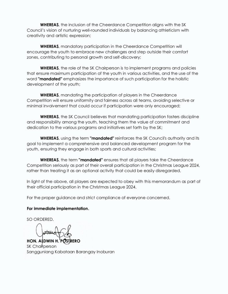 The SK Council mandates the participation of all Christmas League 2024 players in the upcoming Cheerdance Competition. This ensures: