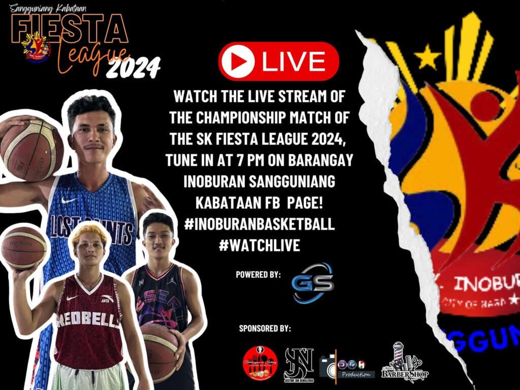 Don’t miss out! Catch the live stream of the SK Fiesta League 2024 Championship Match on the Barangay Inoburan Sangguniang Kabataan Facebook Page.