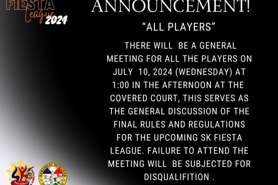 IMPORTANT ANNOUNCEMENT!All players are required to attend a general meeting on July 10, 2024 (Wednesday) at 1:00 PM at the Covered Court. This meeting will cover the final rules and regulations for the upcoming SK… ๐โก SK Fiesta League 2024 Playersโ General Meeting โก๐