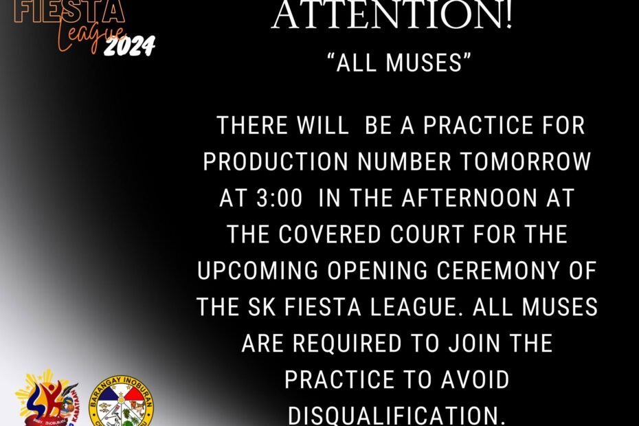 ๐๐๐๐๐๐๐๐๐ ๐๐๐ ๐๐๐๐๐!There will be a practice for the production number tomorrow at 3:00 PM at the Covered Court for the upcoming Opening Ceremony of the SK Fiesta League. This is your moment to shine… ๐ SK Fiesta League 2024 โ Muse Practice Announcement ๐