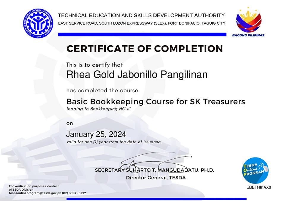 for successfully completing the TESDA Online Program on the Basic Bookkeeping Course for SK Treasurers!