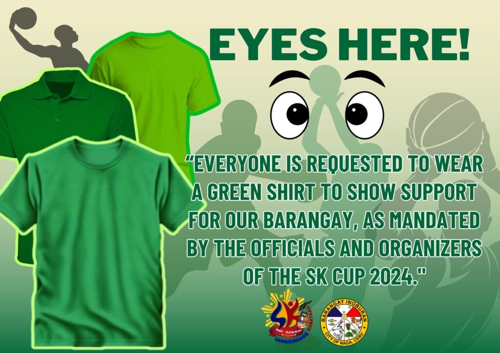 Everyone is encouraged to wear a green shirt in support of our barangay during the SK Cup 2024 championship match. This initiative has been officially mandated by the event organizers and barangay officials to ensure we stand together in spirit and appearance.